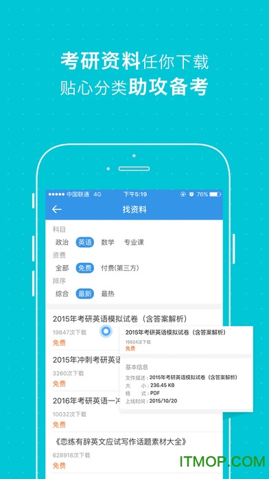 考研帮ios版是一款专为苹果用户量身打造的考研学习神器,它集海量复习资料、真题解析、专业课干货于一体,致力于为考研学子提供全方位的学习支持。无论你是刚刚踏上考研征程的新手,还是正在冲刺阶段的资深考生,这款应用都能满足你的各种学习需求。它不仅支持在线阅读功能,还贴心地提供了离线下载服务,让你在没有网络的环境下也能随时复习,真正做到学习不受时间地点限制。目前这款优质应用已在IT猫扑平台上线,欢迎广大考研学子下载体验!
