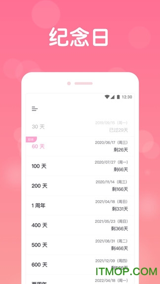 纪念日:提醒每个特殊的纪念日,从此不用再掰着指头数日子;可自定义设置各类纪念日,包括初次约会、见家长等重要节点。