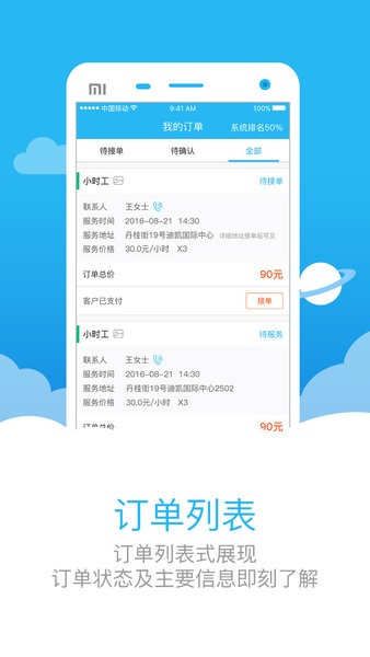 包含强大的订单推送功能,系统会根据您的工作经验和地理位置,智能推送最适合的订单,让您不再为找活而发愁;
