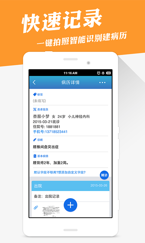 -病例快速记录(一键拍照,轻松识别病例),随时随分享讨论。创新的OCR技术可自动识别各类检查报告和处方笺,将录入时间缩短80%
