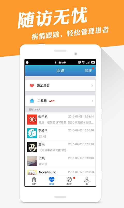 -患者随访无忧,便捷连接医生病人。内置智能提醒功能,可设置复诊时间自动推送通知给医患双方