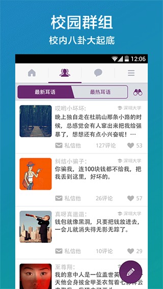 校园群组:特别设计的校园专区,汇集了表白、吐槽、寻人等实用功能。通过匿名身份参与讨论,你可以畅所欲言地分享校园趣事,还能第一时间掌握校内热门八卦。