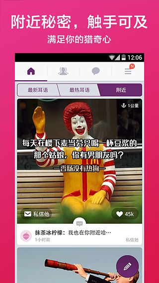 附近秘密:通过智能定位发现身边有趣的人和事,满足你对神秘社交的好奇心。系统会实时更新附近用户动态,让你不错过任何精彩的同城社交机会。
