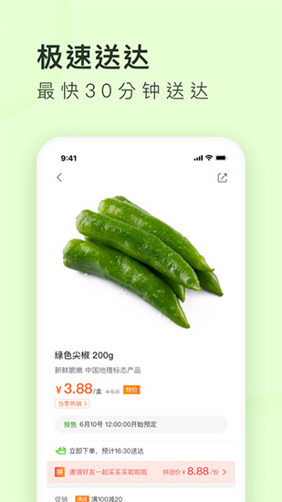 【价格亲民,送货快】平台通过规模化采购降低成本,将实惠直接让利给消费者。同时依托美团强大的物流体系,保证30分钟内将新鲜食材送到用户家门口。平台还经常推出限时特价活动,让用户享受更多优惠。