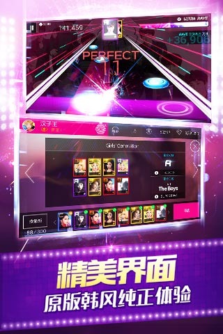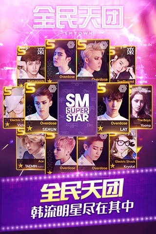 《全民天团韩服》是一款以韩国SM娱乐公司旗下艺人为主题的沉浸式节奏音乐手游。游戏采用横屏操作模式,将音乐节奏点击与卡牌收集完美结合,玩家需要跟随动感旋律精准触控屏幕上的音符轨道。独特的音乐制作人角色扮演剧情贯穿始终,通过完成章节任务可解锁SM艺人专属卡牌和限定曲目。游戏内收录大量SM公司经典热门歌曲,从视觉到听觉全方位还原偶像演唱会氛围,同时融入卡牌分数加成系统,让玩家在享受音乐的同时体验策略搭配乐趣。