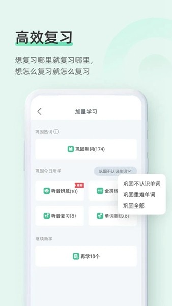 提供"词义回想""听音复习""循环听音"等功能,全方位加强记忆