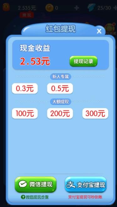 新人一局游戏可秒提0.3元,后续也有多次小的提现机会。游戏设置了多档提现门槛,从0.3元到更高金额不等,玩家通过持续闯关可以积累更多提现机会,提现过程简单快捷。
