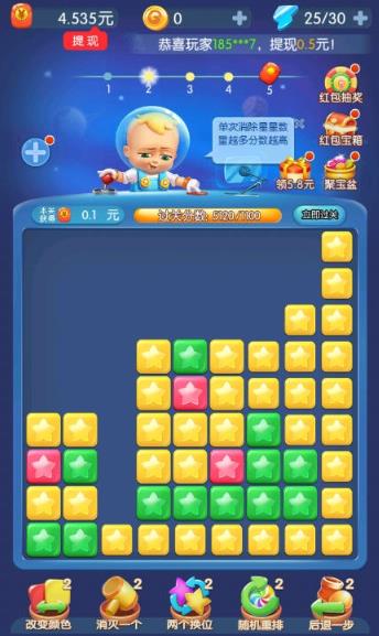 这是一款画面精美、玩法经典的消除游戏,采用清新明亮的卡通风格设计。游戏通过简单的三消玩法,让玩家在闯关过程中享受消除的乐趣,三个相同星星即可触发消除效果。随着关卡推进,难度会逐步提升,需要玩家运用策略才能赢得最终胜利。游戏还加入了红包奖励机制,让玩家在娱乐的同时还能获得实际收益,整体游戏体验既休闲又充满惊喜。
