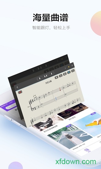 TheONE Piano app拥有两种智能曲谱模式:创新的瀑布流模式和传统的五线谱模式。瀑布流形式的曲谱让您像玩音乐游戏一样弹奏钢琴,即使不识谱也能轻松演奏。经典五线谱模式则提供专业级的乐谱显示,能自动标示需要弹奏的音符和指法,帮助您快速提升识谱能力。曲谱库每周都会更新最新流行歌曲和经典名曲,确保您总能找到心仪的曲目。所有曲谱都经过专业音乐人精心编配,保证演奏效果的专业性。