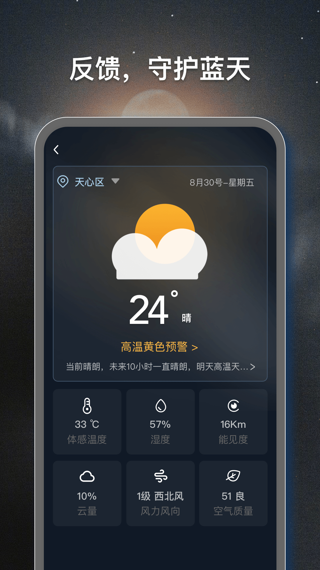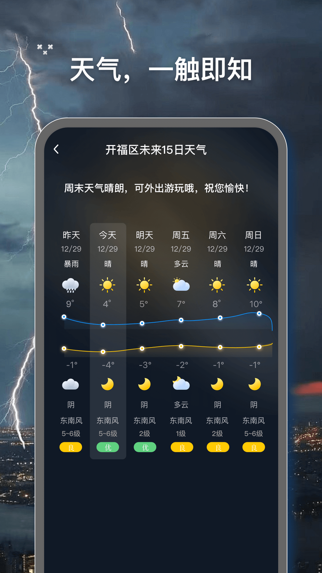 总的来说,天气情况提前知,户外活动更安全是一款功能全面、实用性强的天气应用。它不仅提供了精准的天气预报,还通过多种附加功能为用户的安全出行保驾护航。如果你经常参与户外活动或喜欢旅行,这款应用绝对是你的必备工具之一。