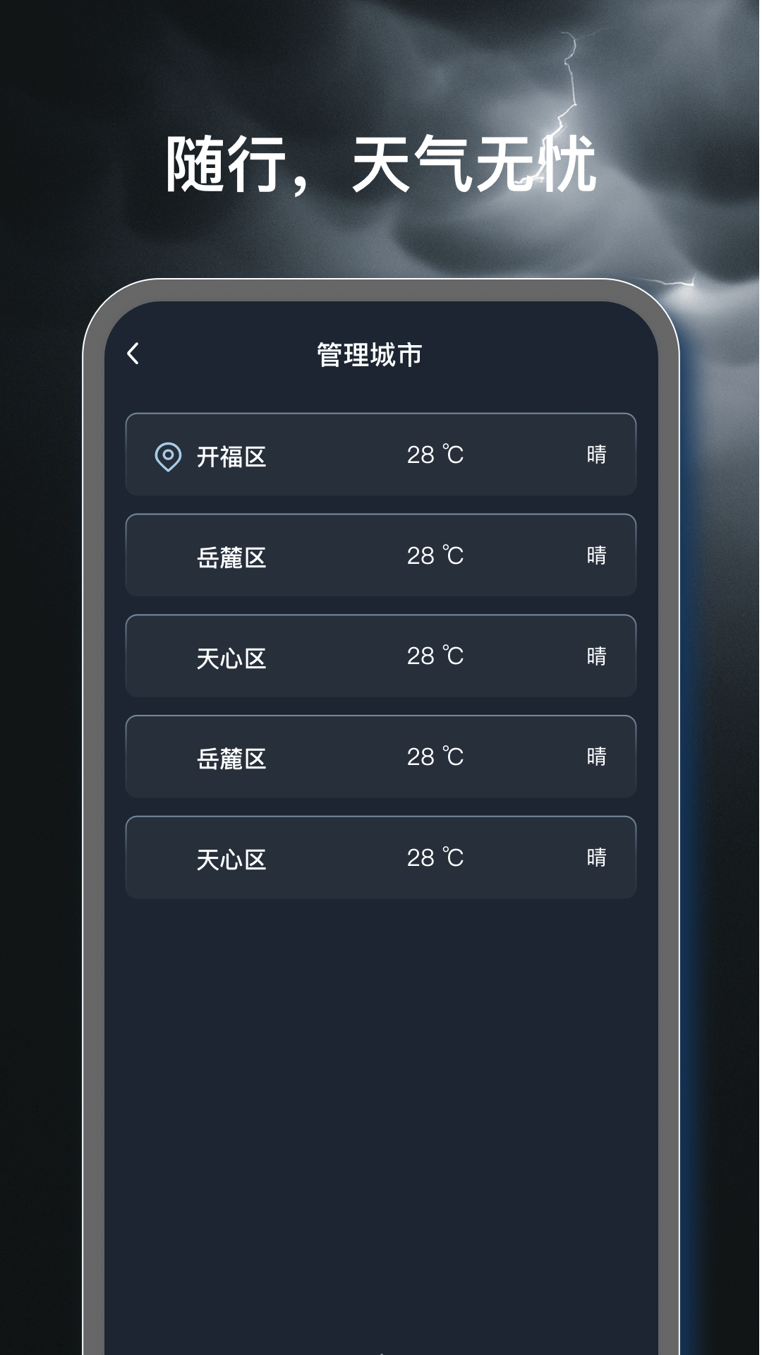 天气情况提前知,户外活动更安全的界面设计简洁直观,操作非常便捷。用户只需输入目的地或开启定位功能,即可快速获取当地的天气信息。应用还支持多地点添加,方便用户同时关注多个地区的天气状况。无论是短途出行还是长途旅行,这款应用都能满足用户的需求。