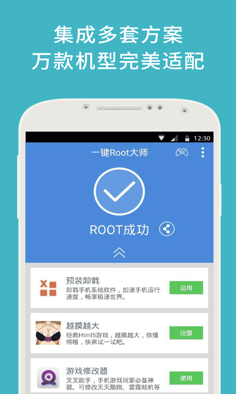 一键ROOT: 一键root大师支持超过5000款机型一键获取root权限,每日更新机型数据库,新增对最新旗舰机型的支持。独创的Root方案智能切换技术,可在Root失败时自动尝试备选方案,大幅提升成功率。