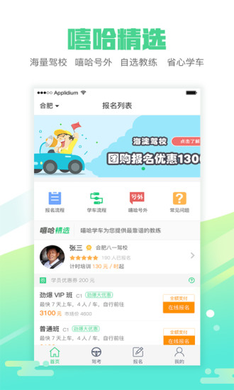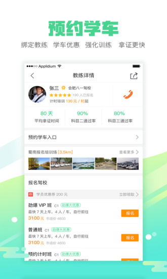 简洁清爽的操作界面,操作功能一目了然,学车信息发布推送一气呵成,像QQ一样简单容易。支付功能利用多元化,可通过支付宝、银行卡、微信支付平台等主流支付平台支付,杜绝教练吃拿卡要等诟病;软件还特别设计了新手引导功能,即使是第一次使用智能手机的老年人也能快速上手,轻松完成预约操作。