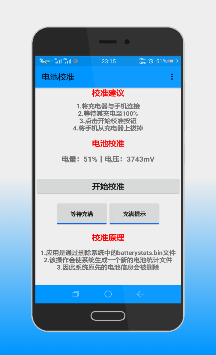 应用需要获取ROOT权限!为确保校准效果最佳,建议在电量20%-80%之间进行操作。校准过程中请保持手机连接充电器,避免中途断电影响校准结果。整个过程大约需要15-30分钟,期间请勿强制关闭应用。