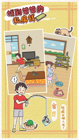 找到爸爸的私房钱是一款极具趣味性的休闲解谜类手游,以家庭生活中常见的"私房钱"为主题,为玩家带来轻松愉快的游戏体验。在游戏中,玩家将扮演家中的孩子,通过细致的观察和聪明的头脑,在家中各个角落寻找父亲精心藏匿的私房钱。游戏采用卡通风格的画面设计,场景布置温馨有趣,让玩家在解谜过程中感受到家庭的温暖氛围。