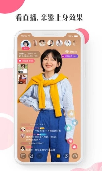 蘑菇街认证主播每天都会在直播间为你试穿最新款服饰。通过直播,你可以直观地看到服装的上身效果和面料细节,真正做到"所见即所得",让网购更加放心。