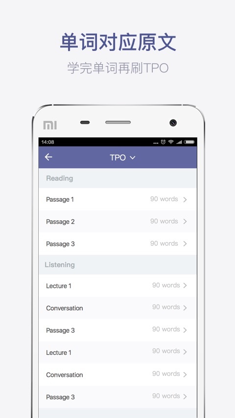 将TPO的核心词汇高亮,结合文章更易学习。学完单词再刷TPO,感觉自己棒棒哒。软件还提供词汇测试功能,可以随时检验学习成果。