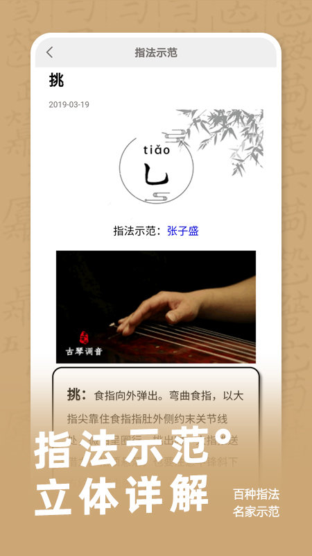 ·古琴技法模块包含吟、抹、挑、勾、剔五种基本指法,帮助用户掌握古琴演奏技巧;