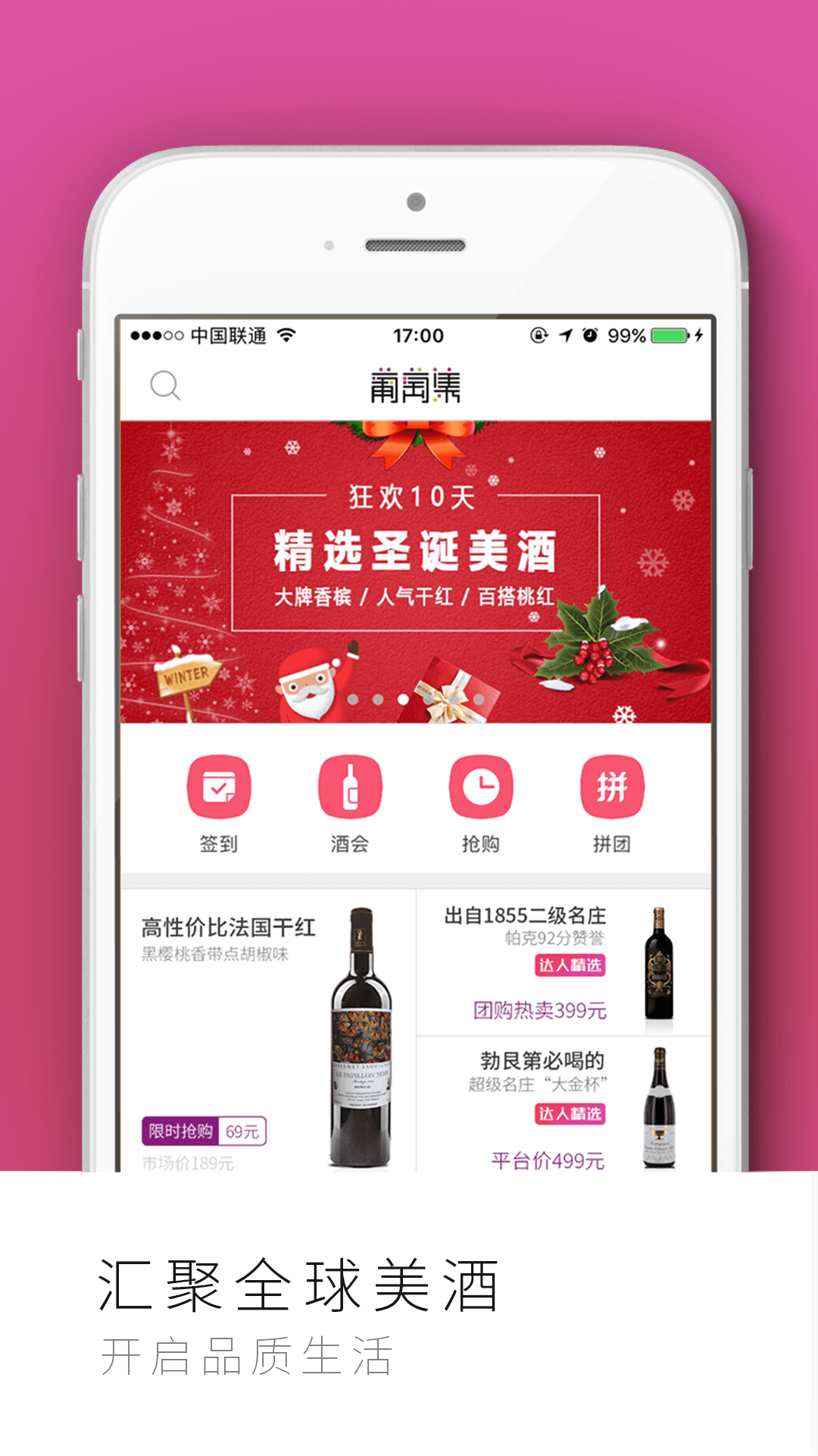 买酒福利:所有酒款低于市场价5折,团购酒款再享触底价,每周更有限时抢,手快有手慢无。平台每月推出特惠酒款专场,新用户注册即享188元新人礼包。我们还提供会员专属折扣和生日特权,让您以最优惠的价格品尝世界美酒。