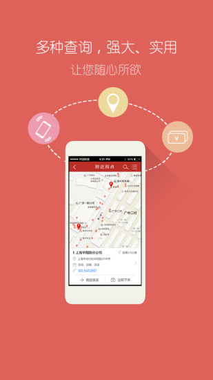 网点查询: 基于LBS技术的智能定位系统,可自动推荐最近服务网点,支持按区域、业务类型等多维度筛选,提供详细的网点营业时间和联系方式。