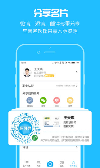 独创的脉可寻影响力指数分析系统采用多维度评估模型,不仅实时呈现关系状态,还能预测关系发展趋势,为您提供专业维护建议。革命性的NFC+二维码双模名片交换技术,支持离线状态下快速建立商务联系,彻底告别纸质名片的繁琐。智能通讯录分析引擎可自动整合来自社交平台、邮件往来等多渠道信息,构建完整的联系人画像。基于深度学习的云端OCR识别系统持续优化算法,确保在各种复杂场景下都能保持超高识别精度。智能提醒功能会根据关系亲密度自动提示最佳沟通时机,让您永远不会错过重要时刻。所有数据均采用银行级加密技术进行实时同步备份,确保信息安全永不丢失。