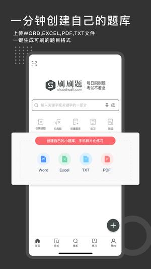 刷刷题APP是一款专业的大学职业资格刷题搜题备考工具,支持多种搜索方式。支持拍照、语音、文字、浮窗以及截屏搜索,拍高数。提供题库和电子错题本制作功能,一键将Word、Excel和PDF文件转化为题库,手机碎片化练习,自动记录错题本。丰富的练习模式及模拟考试和记笔记功能。题库制作完成后,可以与朋友分享,或创建班级让朋友加入,一人创建多人练习