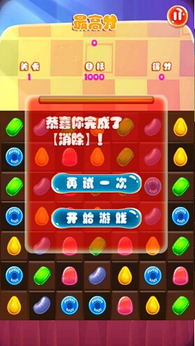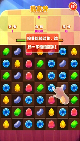 游戏中各种糖果不断的从地下涌向顶端,点击两个以上的糖果进行消除,同时消除相同种类的糖果越多的分数就越多,在糖果不断的上升中快速的点击消灭它们。还可以在游戏开始前购买在游戏中有利的道具,使你在游戏中得到更好的成绩。使用积分加强可在游戏结算时提高30%的最终积分;使用神圣保护可在糖果达到顶部时触发,自动消除下侧3行糖果,从而继续游戏;使用消除提示可以在游戏中时刻提醒你可消除的糖果。