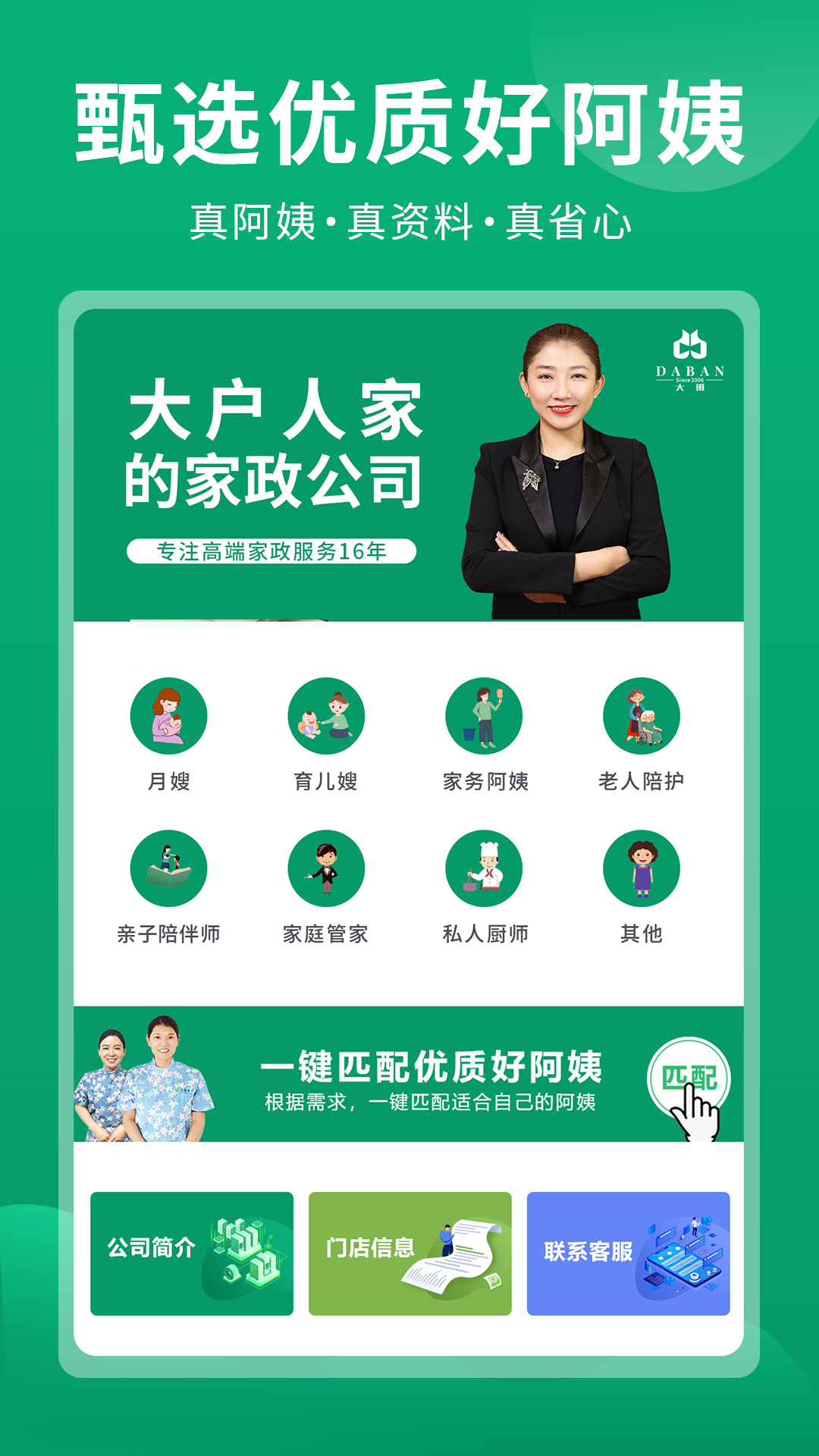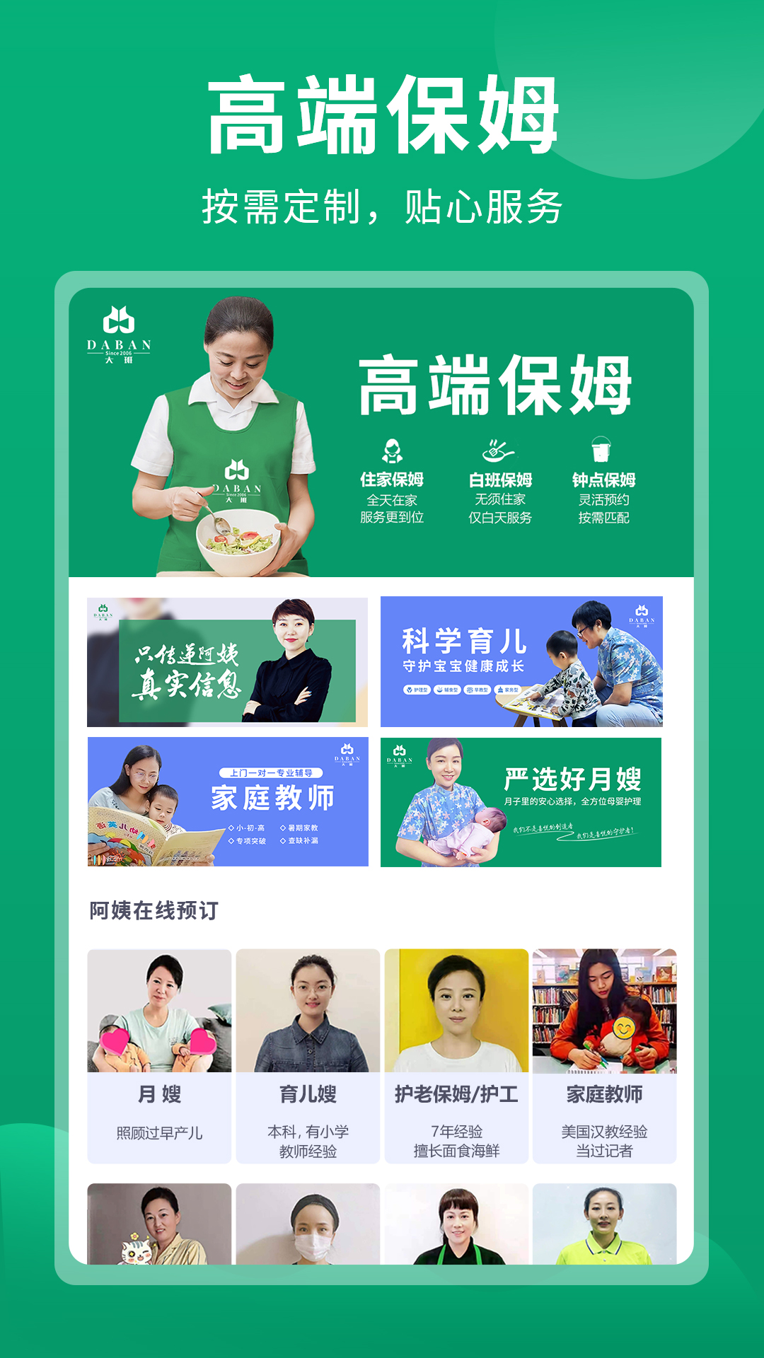 大班家政app始终坚持"真阿姨、真资料、真服务"的三大服务理念。"真阿姨"意味着我们平台上的每一位服务人员都经过严格的身份核实和背景调查;"真资料"保证所有服务人员的资质证书、工作经历等信息真实可靠;"真服务"则体现在我们对服务质量的严格把控,确保客户获得的服务与承诺完全一致。