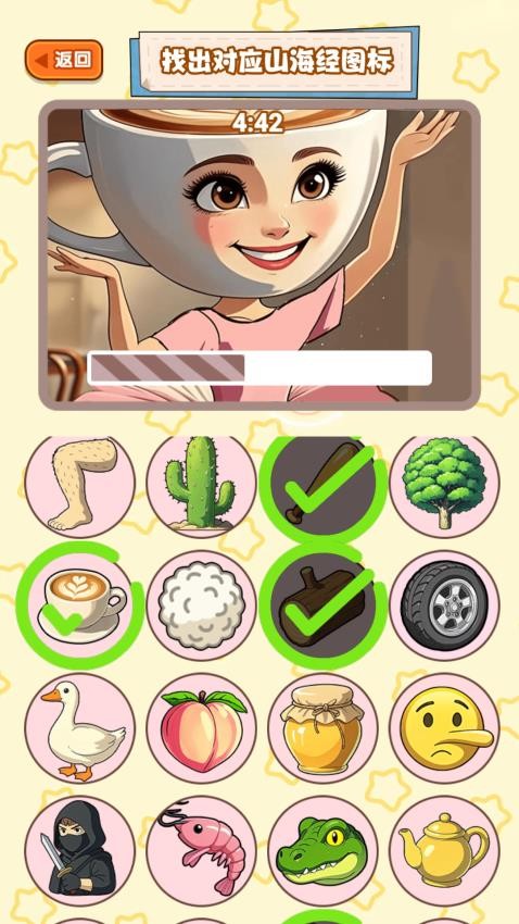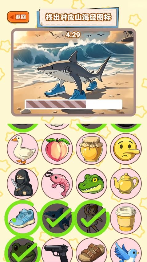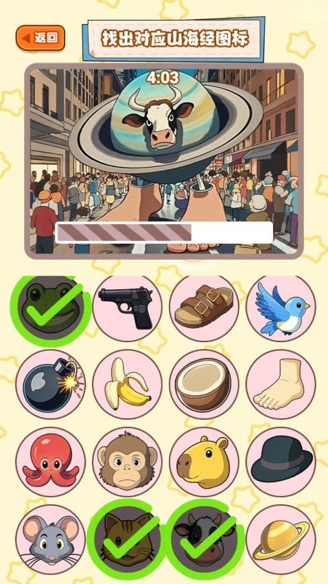 首先选择【看图猜山海经2】关卡,进入找对应图标的挑战模式。游戏会展示一幅包含多种元素的场景画面,玩家需要仔细观察画面中的各种细节。在【找出对应山海经图标】界面,系统会给出目标图标提示,玩家要在限定时间内从下方选项中找到与之匹配的图标。比如遇到青蛙轮胎组合时,需要同时点击【轮胎】和【青蛙】两个图标才能完成部分匹配。当所有选择的图标都与画面元素完全对应时,即可成功通关当前关卡。