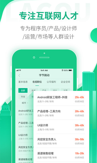拉勾招聘是互联网从业者求职的首选平台,同时也是企业招聘的得力助手。平台汇聚了众多知名互联网企业的招聘需求,每日更新大量高薪职位信息。通过智能算法实现人才与岗位的精准匹配,让求职者可以快速找到合适的工作机会,企业也能高效招揽优秀人才。创新的即时沟通功能让求职者可以直接与企业负责人对话,大大提升了招聘效率。薪资透明、流程规范的特点,让整个求职过程更加安心可靠。