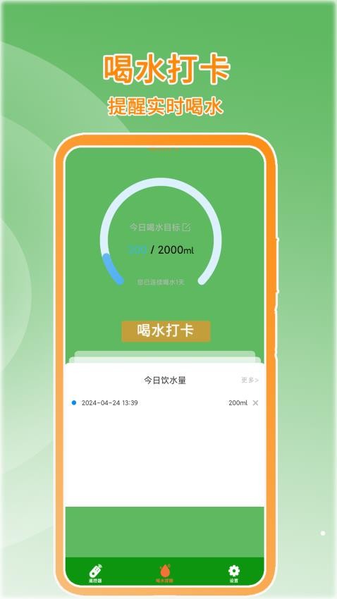 用户可以每天在软件的上进行按时喝水打卡,养成习惯。记录每日饮水量,生成可视化数据报告,帮助用户建立科学的饮水规律。