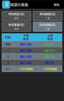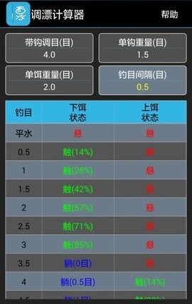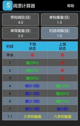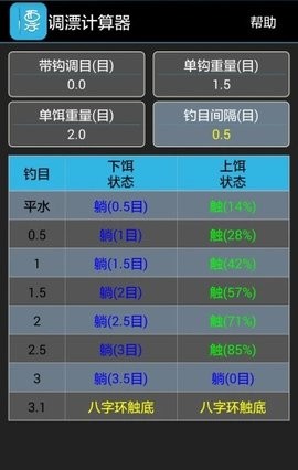 带钩调目:指的是带双钩的半水(离底)调目。软件支持0-30目精细调节,可精确到0.1目单位,并自动计算不同水深下的浮漂变化曲线,附带调目选择建议。