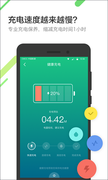 软件提供智能省电方案,包含快速省电、超级省电等多种模式,配合低电量提醒和内存清理功能,全方位优化手机续航表现。基于海量用户数据分析的自学习预测模型,能够准确预估电池可用时间。专业的三段式充电技术确保电量更充足,搭配酷炫的充电屏保让充电过程不再单调。独创的功耗评分系统通过数十项标准全面评估手机用电状况,让用户对电量消耗情况一目了然。