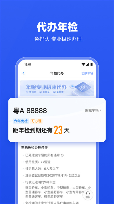【车辆年检】联合邮政服务,车辆年检在线一键搞定,有效年检期到期提醒。新增代办进度实时查询功能,年检过程透明可控。