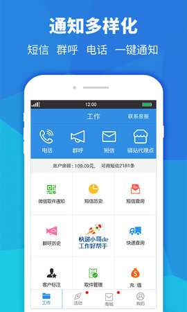 扫描条形码直接发送短信,精准高效,提升工作效率,减少手动输入的错误率。定时群发短信和群呼功能支持自定义时间设置,让快递员能够灵活安排工作,避免高峰期拥堵。个性化的取件管理系统让物流信息一目了然,支持多种查询方式,方便快递员快速定位包裹。通讯录快速搜索功能优化了拨号流程,只需输入关键词即可找到目标联系人。快递员商城提供一站式采购服务,涵盖工作所需的各类物品,从设备到耗材一应俱全。
