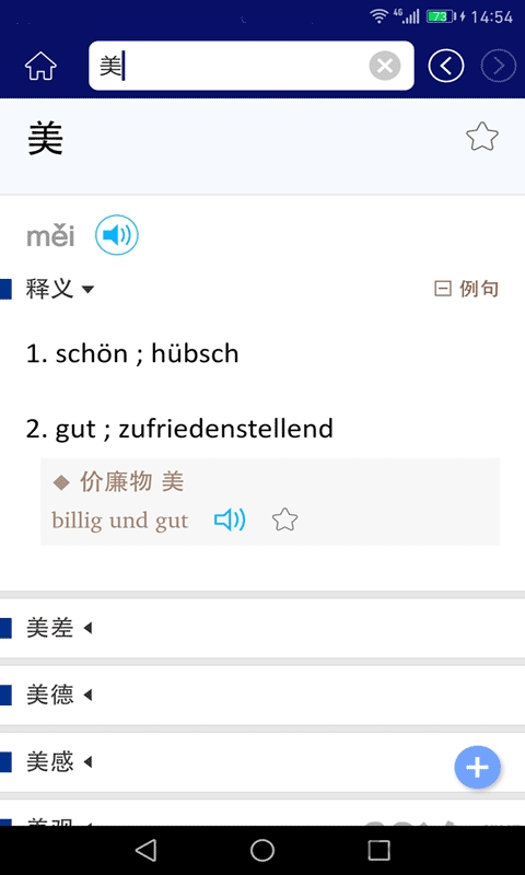 使用非常简单:输入德语或汉语关键词即可进行搜索翻译,点击喇叭图标可播放标准发音,五星图标用于收藏重要词汇,房屋图标则能快速返回首页。此外,软件还支持历史记录查询功能,方便用户回顾之前查找过的词汇。界面设计直观明了,各项功能一目了然,即使是初次使用也能快速上手。