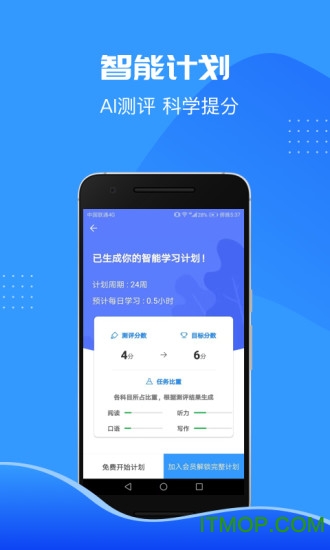 智能计划 基于用户的测评成绩、备考周期和目标分数,智能生成专属学习计划。系统会动态调整学习内容和进度,科学分配每周学习任务,确保备考过程高效有序,让提分效果最大化。