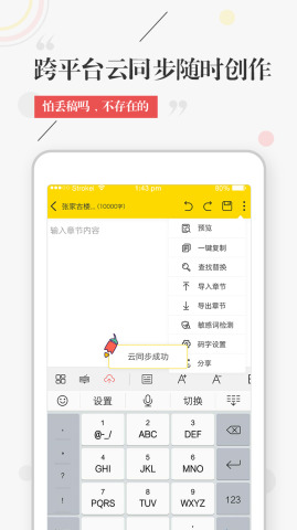 三端云同步、安卓、ios、PC端,后期还会增加网页端。数据实时同步,让您在不同设备间无缝切换,创作不中断。