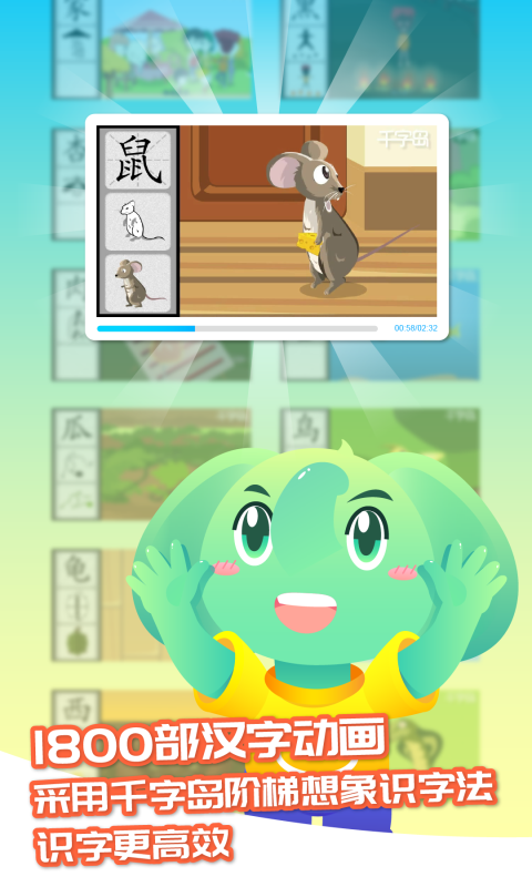1800部汉字动画,采用千字岛阶梯想象识字法,音形义高度统一,识字更高效。