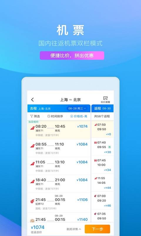 携程旅行网以其极速出票服务著称,支持全天候购票,座位选择灵活自由。国内往返机票采用双栏比价模式,让用户可以便捷地比较不同航班的价格,轻松拼出最优惠的组合。软件还支持全球酒店预订服务,不仅价格优惠,服务质量也有保障。无论您是计划国内游还是出境游,携程都能提供全方位的支持。感兴趣的朋友不妨立即下载体验,开启您的智能旅行新方式。