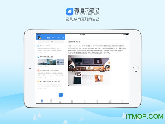 iPad版是一款功能强大的云笔记应用,专为iPad用户设计,帮助您轻松构建个人云端资料库。通过有道云笔记iPad版,您可以高效管理各类文档、图片和笔记,并实现跨平台无缝同步,支持iPad、安卓、iPhone、Mac及Windows设备。无论您身处何地,都能随时访问和编辑文件,大幅提升工作效率。此外,应用还提供丰富的资料收集工具和便捷的分享功能,让知识管理变得更加简单智能。快来下载体验这款集高效办公与便捷存储于一体的优质应用吧!