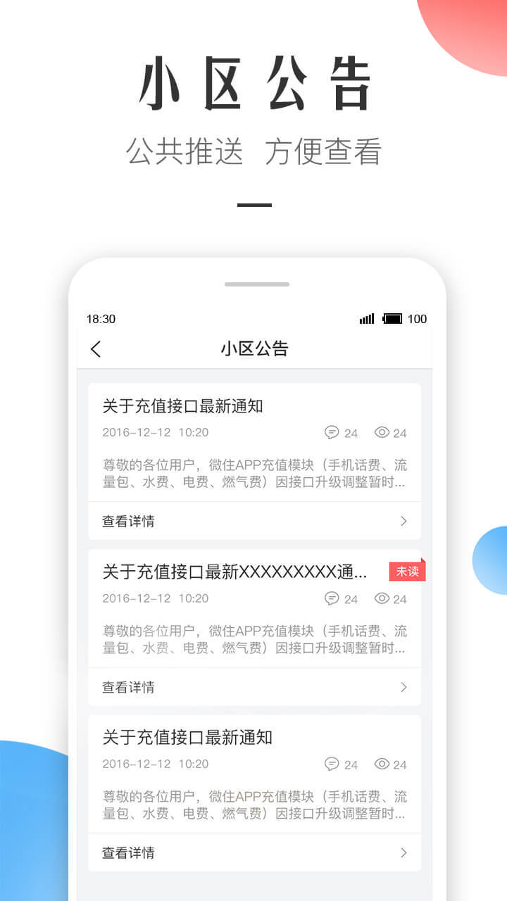 【通知】打造全方位的信息推送系统,重要通知实时送达。支持分类查看、历史查询、已读标记等功能,让您随时掌握小区最新动态,不错过任何重要信息。