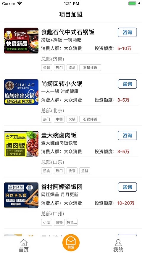 您可以获取我们精心筛选的餐饮加盟、服装鞋包加盟、礼品饰品加盟、家居用品加盟等