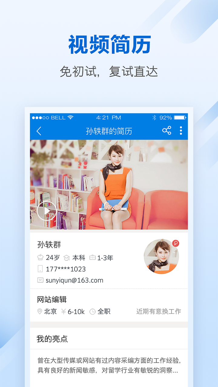 【视频简历】首创视频简历,全新展现自我,告别盲目投递,海量好机会主动来找你。免初试,复试直达;支持多种模板选择,可添加个人作品展示,让HR更直观了解你的专业能力。