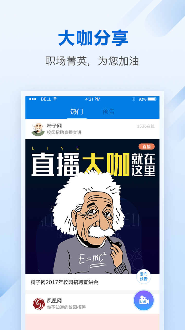 【直播宣讲】随时随地在线直播企业宣讲、行业大咖分享,掌握有深度的职场信息;支持回放功能,不错过任何重要内容。