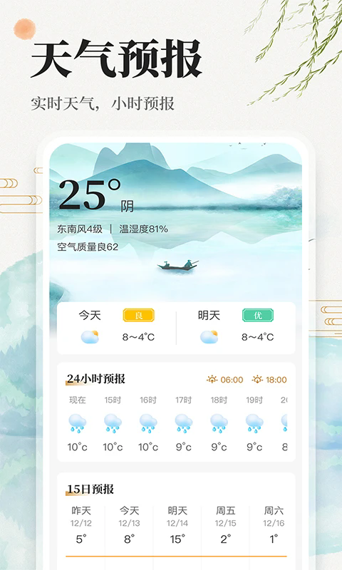 丰富的历法:支持公历,农历,新历,黄历,万年历,干支历等多种历法查询,满足不同用户的需求。相关:每日宜忌事项详细解读,节气时令精准提醒,天干地支知识科普,让用户深入了解传统历法文化。假日提醒:智能识别法定节假日,支持日历记事和行程备忘功能,帮助用户合理规划时间,平衡工作与生活。预报:实时天气信息展示,背景随天气动态变化,提供空气质量、温湿度等全方位气象数据。