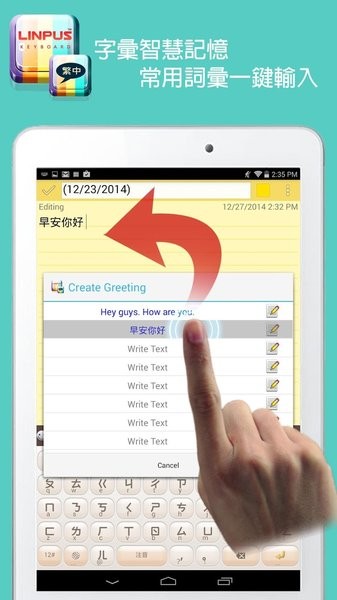 创新的滑行输入技术,支持英文和注音两种模式,通过手指在键盘上的滑动轨迹即可完成输入,大幅提升输入速度。