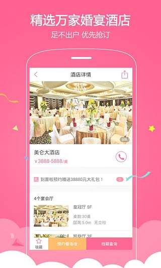 酒店预订:覆盖全国各地的婚礼场地,支持在线比价和预订。特别开发了3D实景看厅功能,让用户足不出户就能考察场地。婚纱摄影:提供多家知名摄影机构选择,支持套餐定制和预约。平台签约了200+知名摄影师,作品风格涵盖各种类型。婚车租赁:多种车型可选,满足不同档次和风格的婚礼需求。从经典婚车到超跑车队,价格透明无隐形消费。婚礼策划:专业策划团队为用户打造个性化婚礼方案。提供从主题设计到现场执行的全流程服务。宾客管理:支持在线邀请函发送和宾客名单管理。智能统计宾客反馈,自动生成座位安排建议。进度跟踪:实时更新婚礼筹备进度,确保各项事宜按时完成。重要节点自动提醒,避免遗漏关键事项。