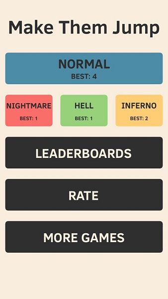 MakeThemJump《起跳吧火柴人》延续了经典游戏《一个都不能死》的核心玩法,但在视觉效果和操作体验上进行了全面优化。游戏提供从两条到五条跑道的多种难度选择,每条跑道上都会随机出现高低不同的障碍物。玩家需要精准地点击对应跑道上方的控制区域,让火柴人及时跳跃躲避。游戏最大的特色在于需要同时控制多个火柴人,任何一个火柴人碰到障碍都会导致游戏结束,这种设定大大提升了游戏的挑战性和紧张感。