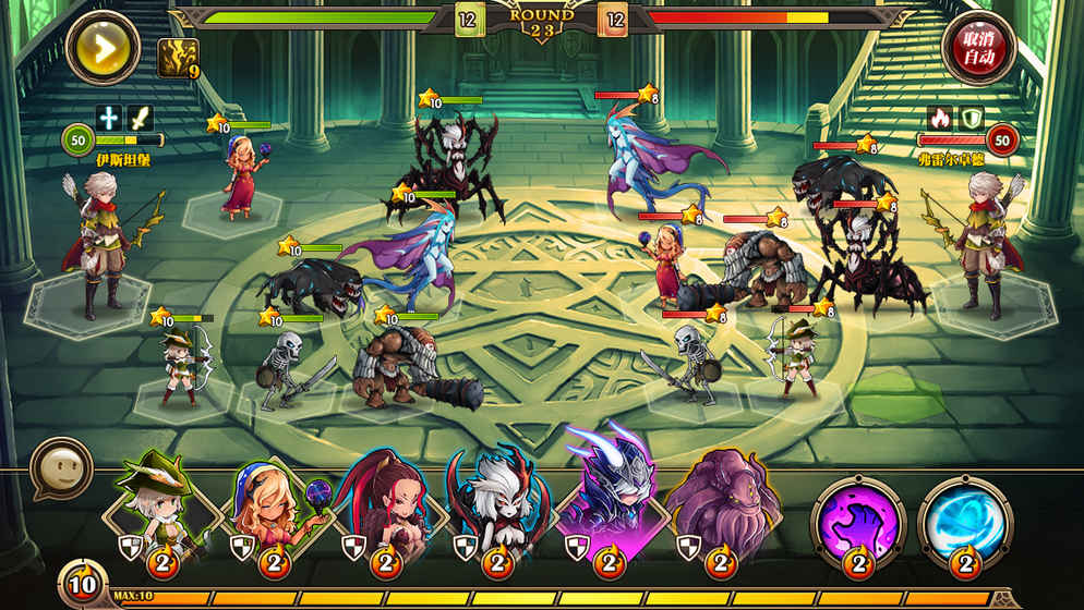 游戏采用了经典九宫格的对战布局,这样的布局使整个战场看起来更加简洁清晰,同时为玩家提供了直观的战略视野。战前玩家可选择一名自己喜欢的英雄和12种各具特色的佣兵进入战斗,游戏目标相当简单,只要击杀对方的英雄就能获得胜利,但需要精心策划每一步行动。游戏中每个操作都是即时生效的,所以在适当的时机上阵佣兵和释放英雄技能是制胜的关键,这要求玩家具备敏锐的战场洞察力。无论是英雄的选择还是技能的挑选亦或是佣兵的搭配都使整个对战具有相当高的策略性,玩家需要不断调整战术来应对不同对手。每个佣兵的站位放置也十分讲究且多变,玩家需要根据对手的佣兵站位时刻调整己方上阵的佣兵来为战局积攒优势,这增加了游戏的深度和可玩性。当然游戏中也会有一定的运气成分,一些概率性的佣兵技能都能给战局带来意想不到的惊喜,使弱者也有战胜强者的可能,这种设计让每场对战都充满变数。